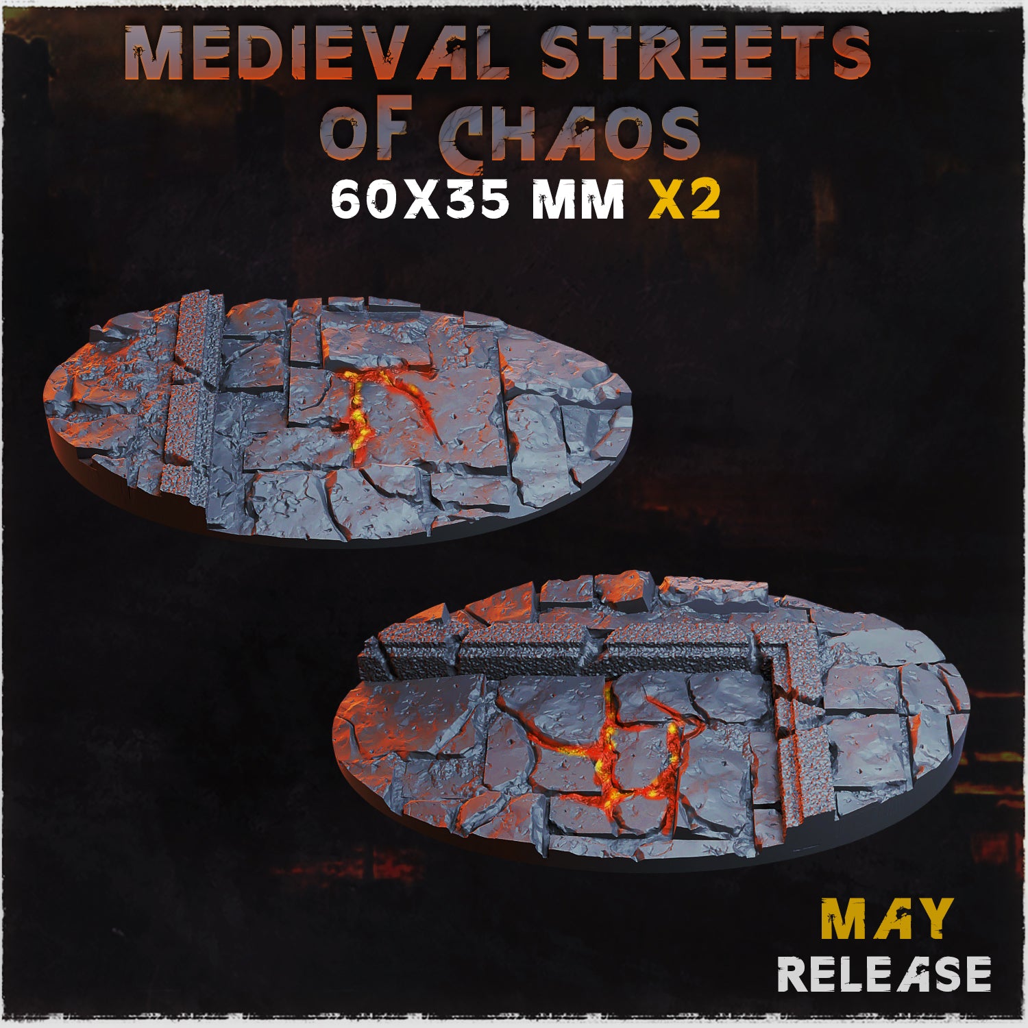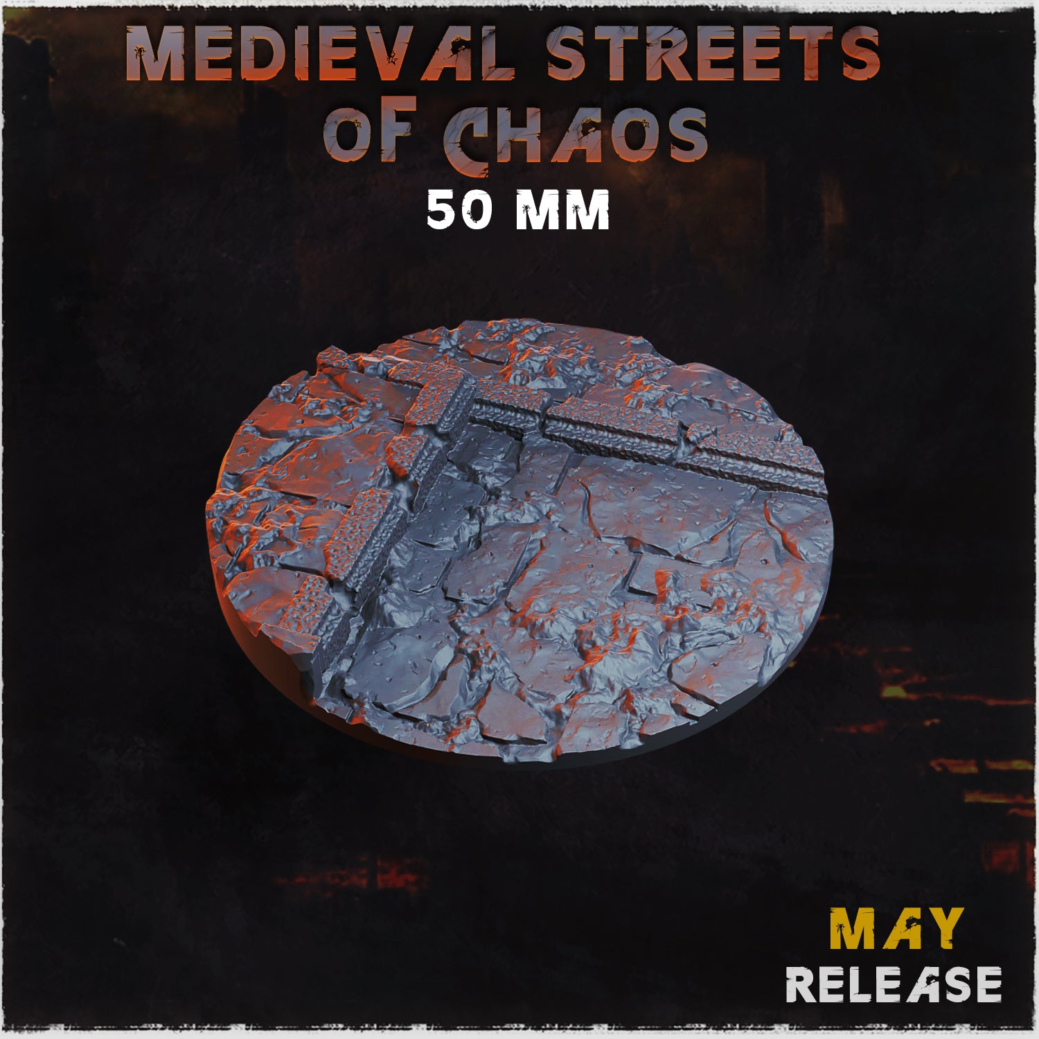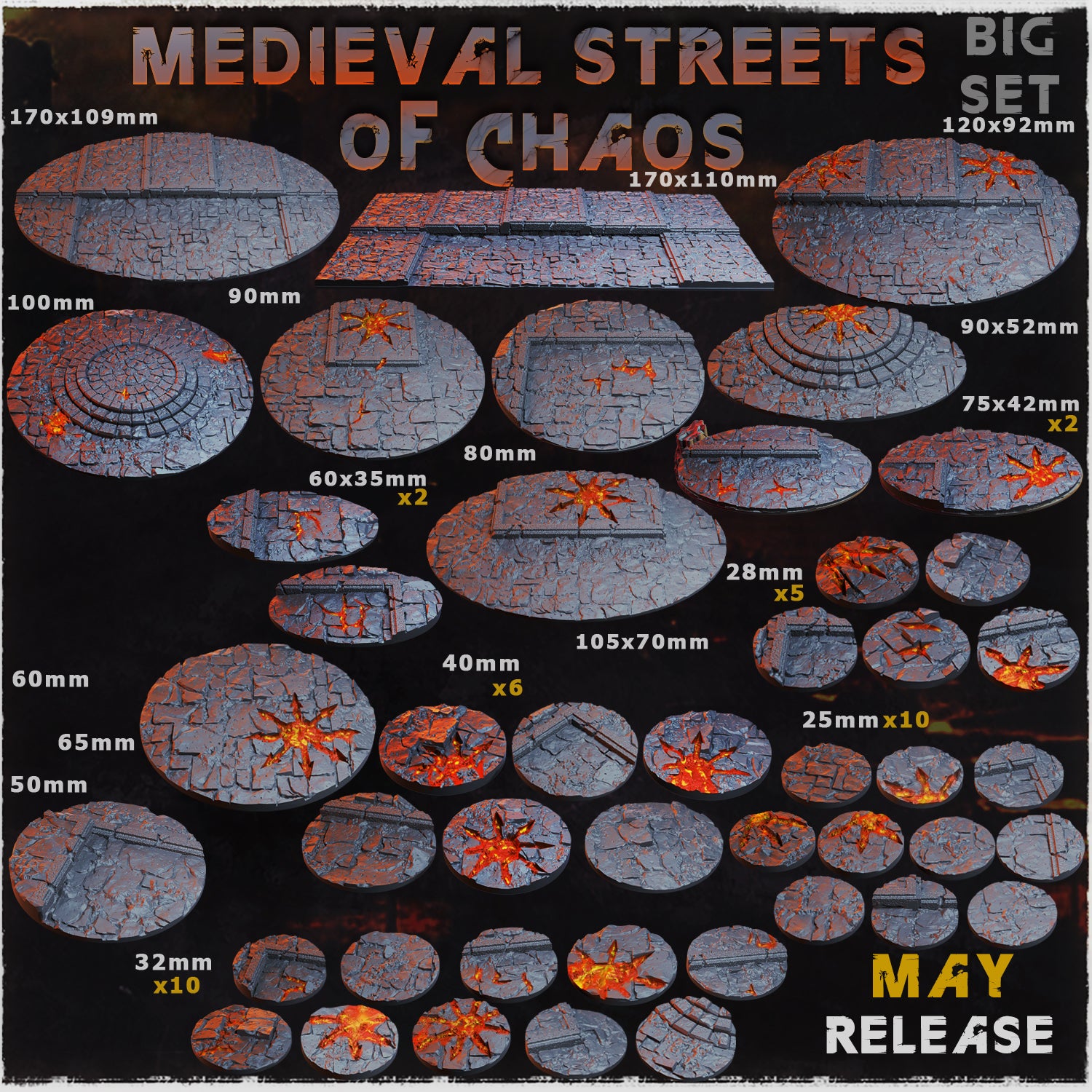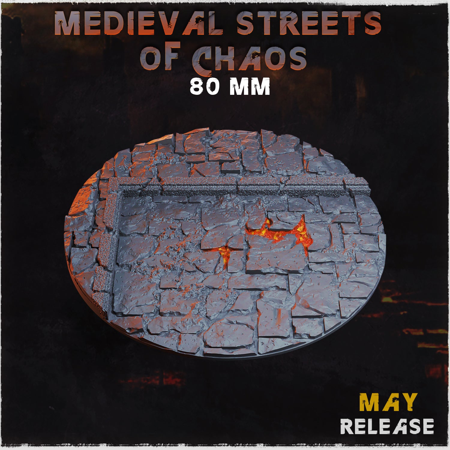Unleash the fury of chaos beneath your miniatures with the Medieval Streets of Chaos Themed Bases.